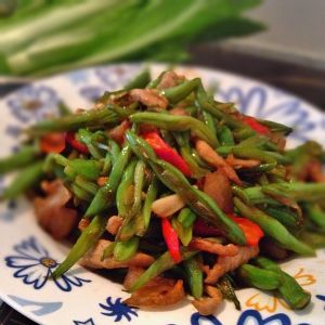 炒完肉后,锅中余部分油,再加一点食用油,将四季豆入锅翻炒,基本熟后再将炒好的肉片和辣椒一起倒入锅中翻炒,这时加入味极鲜和盐,炒匀后即可出锅。