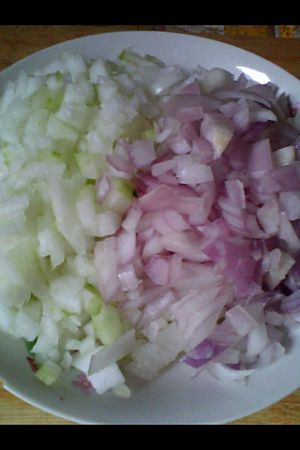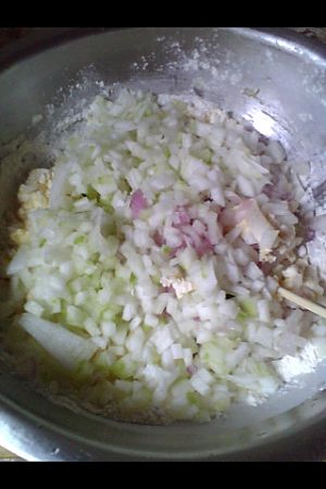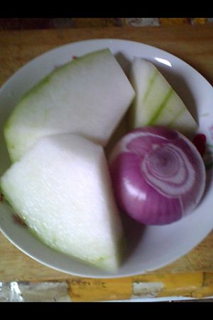 加入切好的冬瓜洋葱丁,盐,十三香。