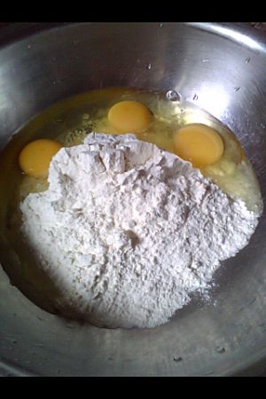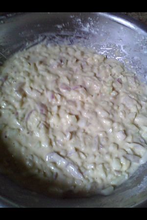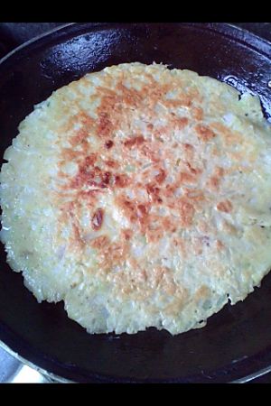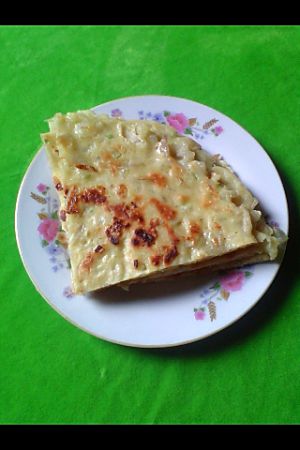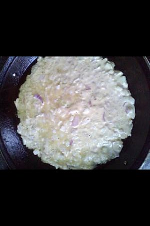 锅中倒少许油倒入调好的面糊用铲铺匀。