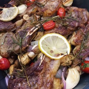 腌制时候放的迷迭香和柠檬片不要扔掉,继续放在羊排上一起烤制。烤箱预热220度(温度根据自家烤箱可以适当调整),烤制25-30分钟,中间可以给羊排翻个面。