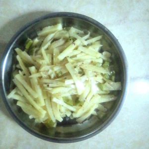 倒入土豆丝,炒熟之后往锅边倒入白醋。放白糖和盐。这样就大功告成了。