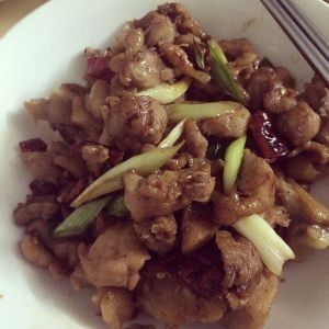锅内留底油,将辣椒段,蒜头片,姜丝下去爆香,在加入炸好的鸡肉丁进行翻炒,加入适量的盐,酱油,最后加入孜然粉,蒜苗再翻炒几下即可装盘
