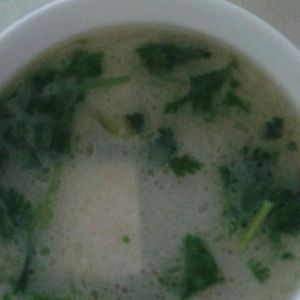 加入温开水,大火烧开,放盐,放入豆腐,小火炖一会,放香菜,煮至奶白色就可以出锅了