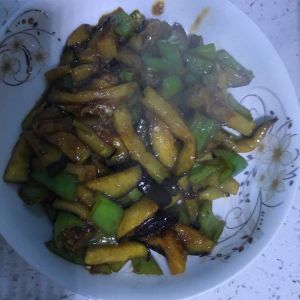 先用小火煎茄子,盛出备用,放入葱蒜,青椒翻炒,倒入煎好的茄子,再将调好的汁料倒入锅中,大火烧,收汁。