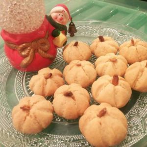 用牙签压出花纹,然后在中间插上瓜子仁,小南瓜就完成了,在烤盘上铺上烘培油纸,把小南瓜均匀的摆在烤盘上。