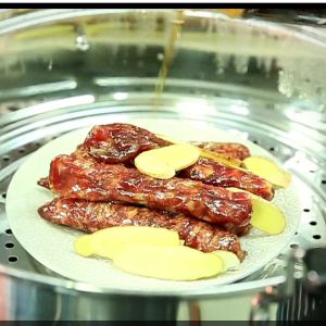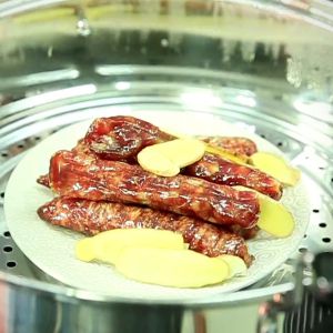 黄酒淋在香肠上,蒸8分钟左右。