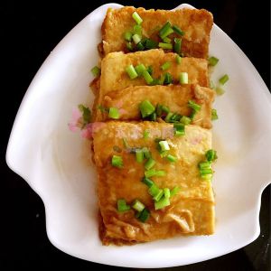 锅内(平底锅最佳)放入油烧热,将豆腐放入小火煎制
