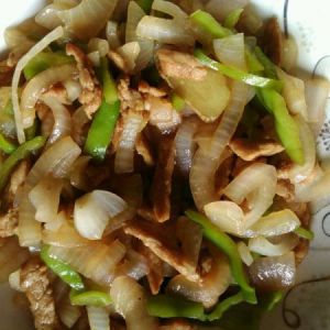 肉至金黄,加入洋葱青椒煸炒,按照口味加入少许盐。
