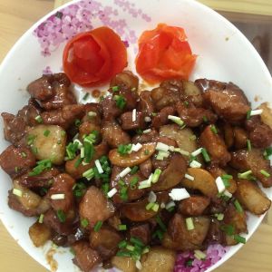 收汁前,用适量生粉兑水搅拌均匀倒入五花肉锅中,不断用木铲炒,直到生粉汁液和五花肉汤汁都干了,收汁关火准备装盘