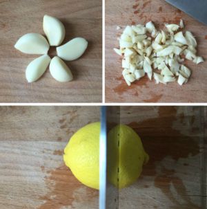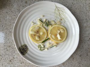 准备调味:把蒜剥皮、压碎、略切几刀成比较大的块;柠檬切片;制作迷迭香碎叶。
