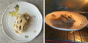 烤盘可以用纯瓷、不带金属的盘子,也可以放在烤箱带的烤盘上,如果是后者则需要垫烧烤纸。