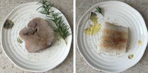 化冻之后,将鳕鱼块双面撒上黑胡椒和海盐,腌制20分钟,同时也在室温环境中进一步化冻。