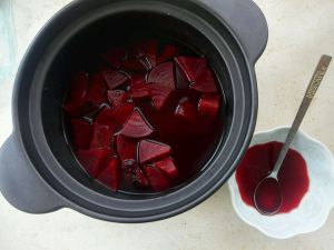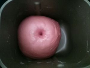 甜菜根切块,放入锅中,加水至埋住甜菜根,煮开后关火,冷凉后称出90克的甜菜根水,倒入面包机桶内,加奶粉~盐~糖~鸡蛋~黄油~高粉,面粉上挖个洞放酵母,面包机选择发面程序,在发面程序还有5分钟时关掉程序,让面团继续发酵