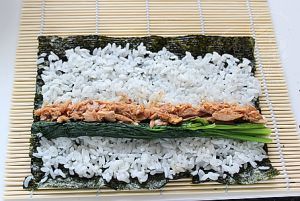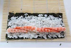 这个要做鲜虾细卷,取一半的烤海苔片铺上米饭放上去皮的虾仁,卷实。