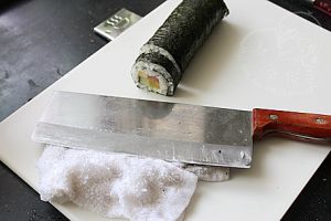 卷好的紫菜包饭用刀切成1-1.5厘米宽的片。