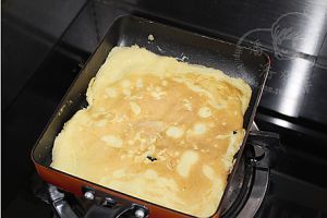 煎锅中倒入适量的食用油把蛋饼凉面煎黄。