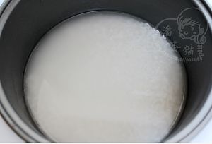 圆粒大米淘洗过后用凉水浸泡二十分钟后用电饭煲焖熟。