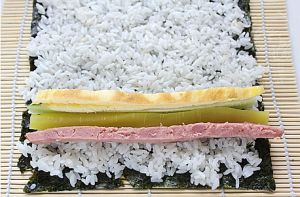 把米饭铺在烤好的整片海苔上,把火腿条、腌萝卜条、黄瓜条、鸡蛋条放在米饭海苔片的三分之一处。