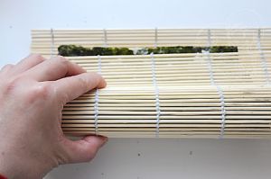 用寿司竹帘用寿司帘卷起,一定要卷紧这是很重要的如果卷的不紧的话,切的时候就会松散开来。