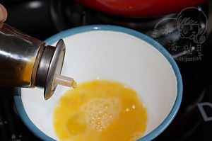 摊鸡饼前,先在两个鸡蛋里加入一小勺料酒、适量的盐,然后打匀。