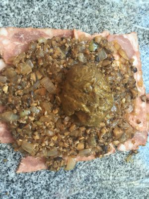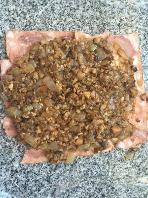 保鲜膜上放入培根或者火腿,上面铺上凉的蘑菇酱