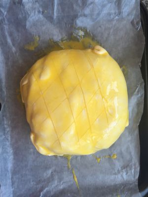 冷藏好后取出,划出想要的纹路,抹上蛋黄液