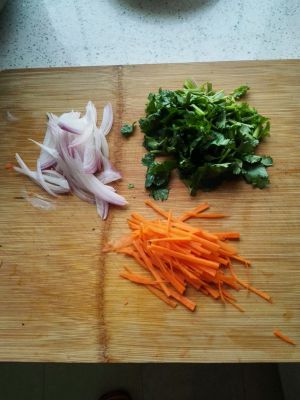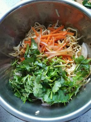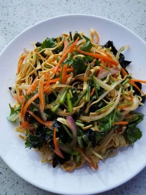 凉透的豆腐皮加上圆葱丝胡萝卜丝跟香菜段,依个人口味淋上适量味极鲜,醋,香油,拌匀