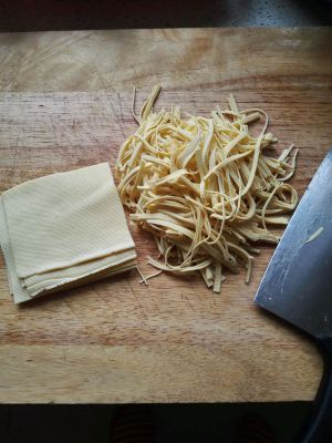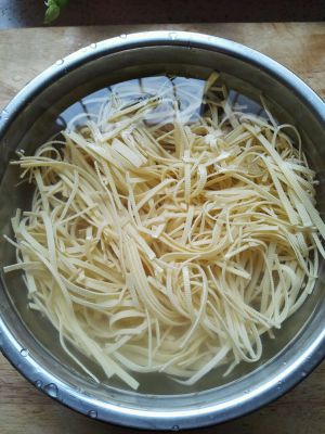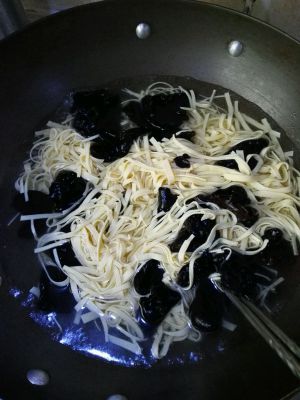 烧开水将豆腐皮跟黑木耳焯2-3分钟,捞出放盆里凉透(木耳比较大可以切成丝)