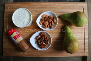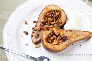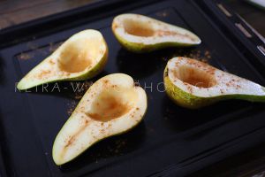 啤梨洗净后对切成凉拌,挖去梨核,在梨的碗状小坑中各填入半茶匙蜂蜜并均匀的撒上肉桂粉;