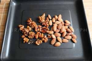 待梨烤好后装盘,撒上核桃碎和杏仁碎,并配上一勺酸奶冰淇淋,加一茶匙干邑即可。