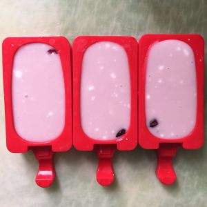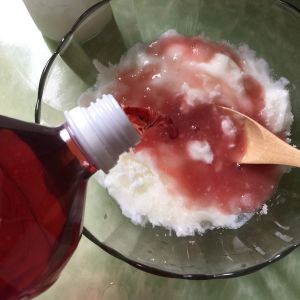 牛奶加糖混合均匀,加入蔓越莓果汁混合