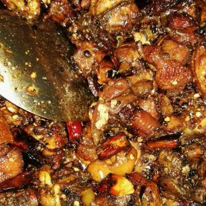 加入干辣椒,并多加入油,把辣椒炒变色
