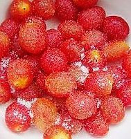 把樱桃西红柿放一个盆里,撒上些白糖,放冰箱腌制2个小时。