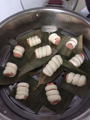自发面粉用水和好,待发酵30~60分钟(时间由当时气温来定)。把发酵好的面切成一小团,再搓成条,然后绕到切好的香肠上(香肠切段自己订),就如同上图了