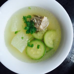 西葫芦、冬瓜切好备用,水沸后的排骨在锅中加完葱白等加入;