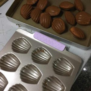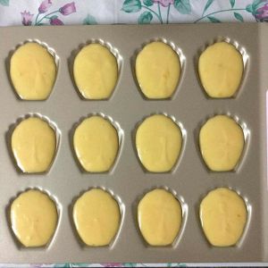 面糊从冰箱取出,稍微搅拌下,装入裱花袋中,玛德琳模挤8分满即可