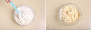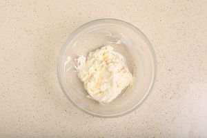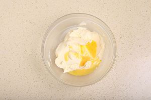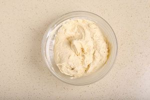 蛋液与淡奶油一起加入奶酪中。用搅拌铲充分搅拌均匀即可