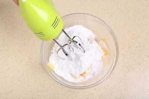 黄油切成片,常温下软化。倒入糖粉。把糖粉和黄油充分的搅拌均匀