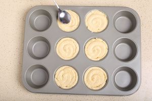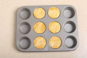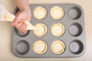 面皮的料放入裱花袋中,减一个差不多1CM的口。以螺旋的方式挤满底部。按压平整