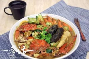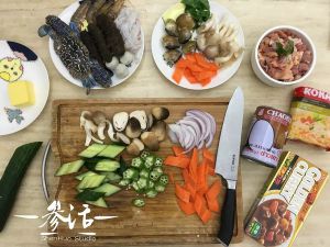 另起油锅,放入黄油融化,加入蒜片爆香,接着加入胡萝卜煸炒,再加入洋葱,蘑菇,鸡肉,鱿鱼,虾,鱼丸,螃蟹,黄瓜等食材翻炒