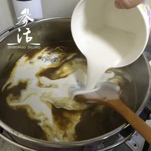 准备咖喱汤锅:汤锅加入一碗水煮开,放入咖喱块小火搅拌让其融化,后加入椰浆,柠檬,盐和鱼露,烧开后放入海参,蛤蜊,小火焖煮