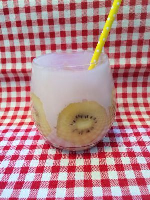 先把奇异果切薄片粘在杯子上,倒入酸奶