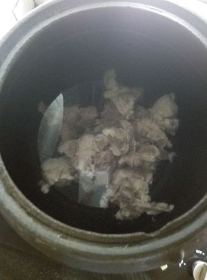 把滴干水的排骨放入先前备用掺好水的砂锅里,开大火,盖锅焖煮。