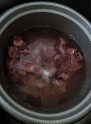 排骨煮的时候会冒泡泡,期间把泡泡给舀了扔掉。排骨烧开以后,倒入我们前面清洗好的绿豆(犹豫光线比较暗,拍了也看不出来,所以我果断放弃了,各位知道已经放了绿豆就行了╭(╯ε╰)╮)
