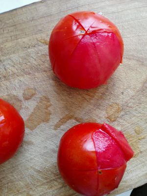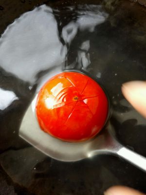 番茄上下十子花刀,入沸水去皮。