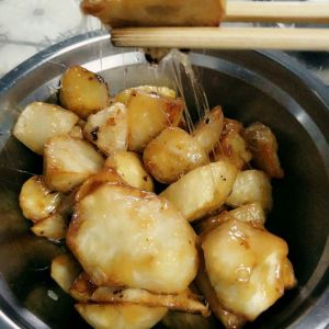 另外起锅放入平时炒菜那么多的油 烧至三成热 然后放入白糖 改小火慢慢的搅拌锅里的糖 记住一定要小火 不停的搅拌 多炒一会儿 直到糖变得细腻粘稠 就可以放入炸好的地瓜 用锅铲搅拌都均匀的粘上糖稀就可以装盘出锅了