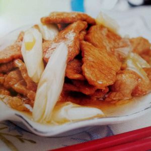 锅中留底油烧热,加入葱片爆香,放入滑炒好的羊肉,酱油,味精,料酒,翻炒均匀。