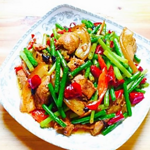 翻炒至郫县豆瓣酱完全呛入回锅肉里后,加入蒜苔,青椒,红椒,适量盐,继续翻炒。炒至蒜苔完全熟透,鸡粉调味,勾芡一下,即可起锅装盘。