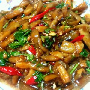 现在,锅里的茄子已经煸炒到水分蒸发,很软了,可以偷偷尝一口,体会一下茄子是不是还水塌塌的,如果是就继续煸炒一会。