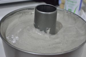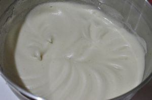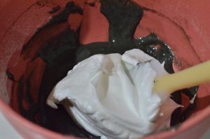 分三次将蛋白霜加入蛋黄糊中切拌均匀